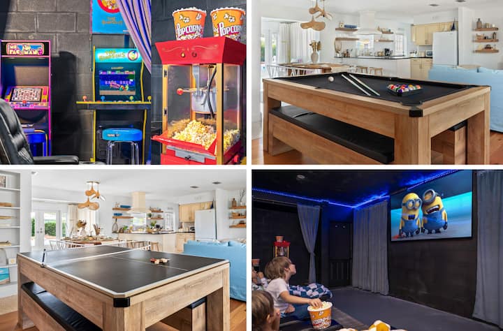🎥 Theater/Arcade Room: 8 electric recliners, 86” Smart TV & LG sound system, popcorn station, Simpsons arcade & 14 classic Pac-Man games