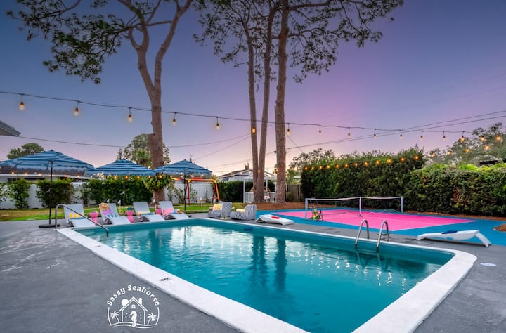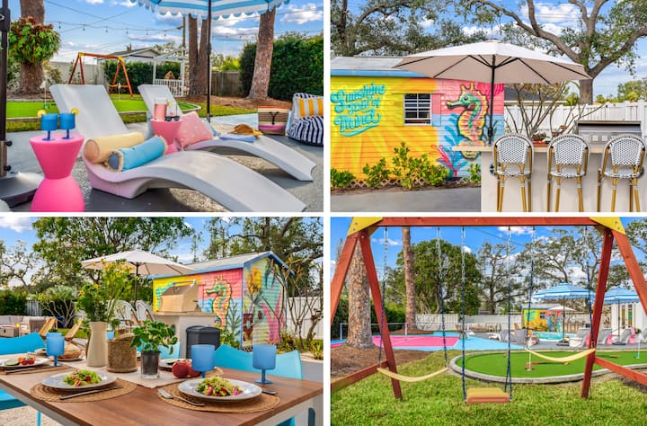 Escape the winter chill at Sassy Seahorse—your sun-soaked Florida getaway. Lounge by the heated pool, play pickleball, or enjoy mini golf in the backyard that glows at night. Enjoy family fun with a private movie theater, arcade, outdoor movies, BBQ dinners, and s’mores by the fire pit while watching the little ones swing and laugh. Cook gourmet meals in the fully equipped chef’s kitchen. Just 15 minutes from gorgeous beaches, IMG Academy, nature preserves, and outdoor adventures. Pups welcome!