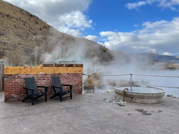 The Lodge at Hot Lake Springs: a historic brick hotel on the edge of a lake steaming with hot springs. Enjoy relaxing in the five shared hot springs soaking tubs that overlook "Hot Lake" and the surrounding mountains.