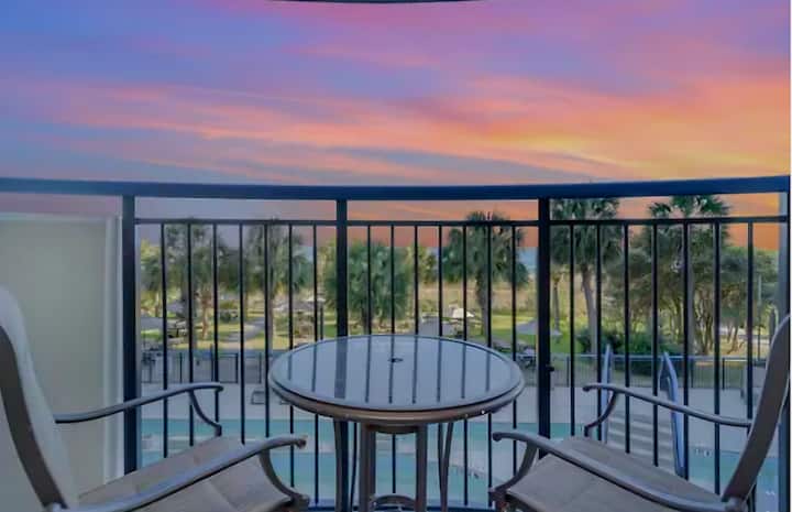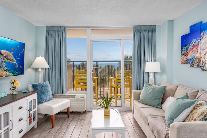 Come stay & play at Myrtle Turtle! Our newly purchased & re-decorated sea turtle themed condo is so cute & cozy! This oceanfront condo at Boardwalk Oceanfront Resort features indoor & outdoor pools, a lazy river, kiddie pool & hot tubs! Enjoy your drinks on the private 1st-floor balcony where the skyline offers both sunrise & sunset cloudscapes! The balcony has views of the lazy river, palm trees & the ocean! With 2 queen beds plus a full murphy bed, there's room to sleep 6 in this 1 bdrm condo!