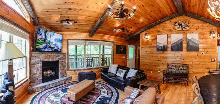 Our Cabin is a 3 1/2 bathroom home, featuring 2 in-suite bedrooms, a queen bunk bed, a trundle, and several sleeper sofas throughout for up to 12 guests. Have fun using our Game Room, Hot Tub Spa and Infrared Sauna while you keep the cold out using our outside fire pit or inside gas fire place and embrace the outdoors with our real bark wood accent beams. Our kitchen features stone countertops and latest appliances, including an all-in-one Keurig and Nespresso original line coffee maker. If you have an electric vehicle use our fast EV charger for a flat fee and juice up your EV every day during your stay!