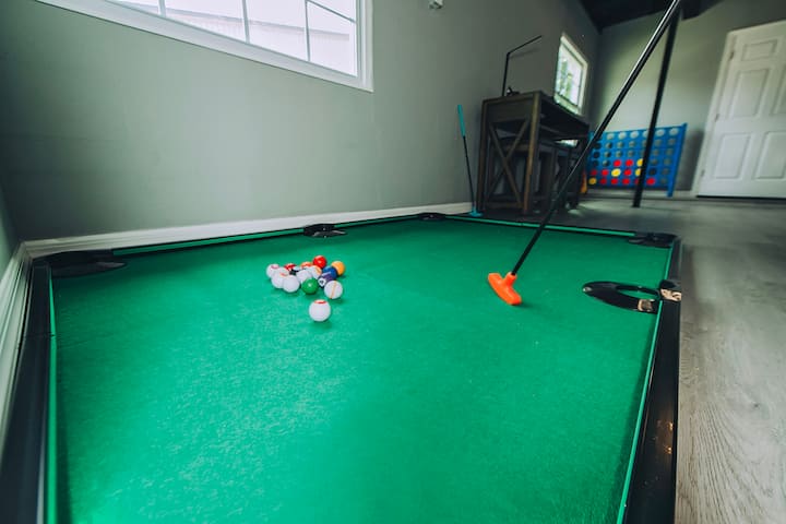 Kick back and unwind in this cozy entertainment haven, featuring a large projector screen for the ultimate cinematic experience. Sink into oversized bean bags and enjoy your favorite movies in relaxed comfort. Beyond movie nights, the space invites friendly competition with a fun pool mini golf game—perfect for entertaining both kids and adults. Whether you’re streaming a blockbuster or challenging your friends to a game, this room is all about laid-back fun and memorable moments.