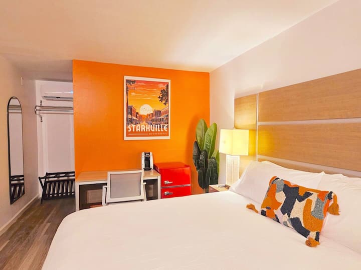 Welcome to the Far Out Motel, just a stone's throw from MSU! Step into a blast from the past with our retro-inspired rooms, revamped with a modern twist for your ultimate comfort.