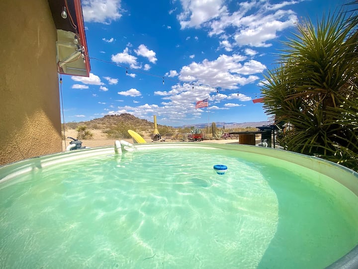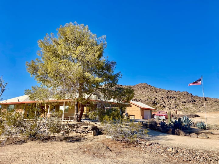 Summer Sale Pricing on Now!! Best Deal around on the Coolest House! The Super 70s is a 10 acre desert retreat. The house is dripping in Psychedelic 70's Brady Bunch Good vibes, and sits at the base of the 350 foot Shadow Mountain, in an extremely private little cove, with no immediate neighbors . Soak in the Stock Tank Pool by day, spin records and have drinks by the outdoor fire place by Night. You will have all the privacy and seclusion necessary to fully decompress from the outside world.