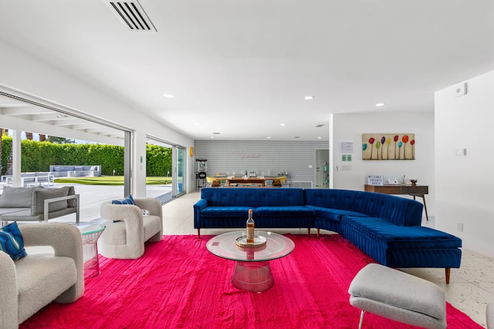Immerse yourself in the Palm Springs lifestyle at The Encanto House, a vibrant four-bedroom vacation rental tucked into the desirable Tahquitz Creek Golf Resort neighborhood. This mid-century modern retreat is where bold design meets laid-back luxury—an experience curated for style-savvy travelers, outdoor enthusiasts, and memory-making families alike. Whether you're floating in the crystal-clear pool under the desert sun, sipping cocktails by the fire pit at sunset, or teeing up on your own private putting green, every corner of this home delivers on comfort, beauty, and fun. Beds: K,Q,D,D