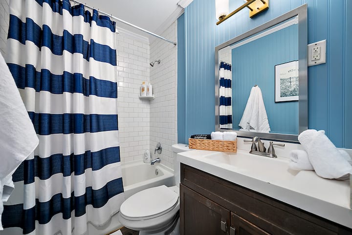 The bathroom at Casa Rosa is conveniently located between the two bedrooms, offering a bright and refreshing space with a modern coastal design. The shower-tub combo is perfect for families, and the bathroom is fully stocked with complimentary bath towels, hand towels, washcloths, makeup towels, a hair dryer, and bath-time essentials to ensure you feel pampered!