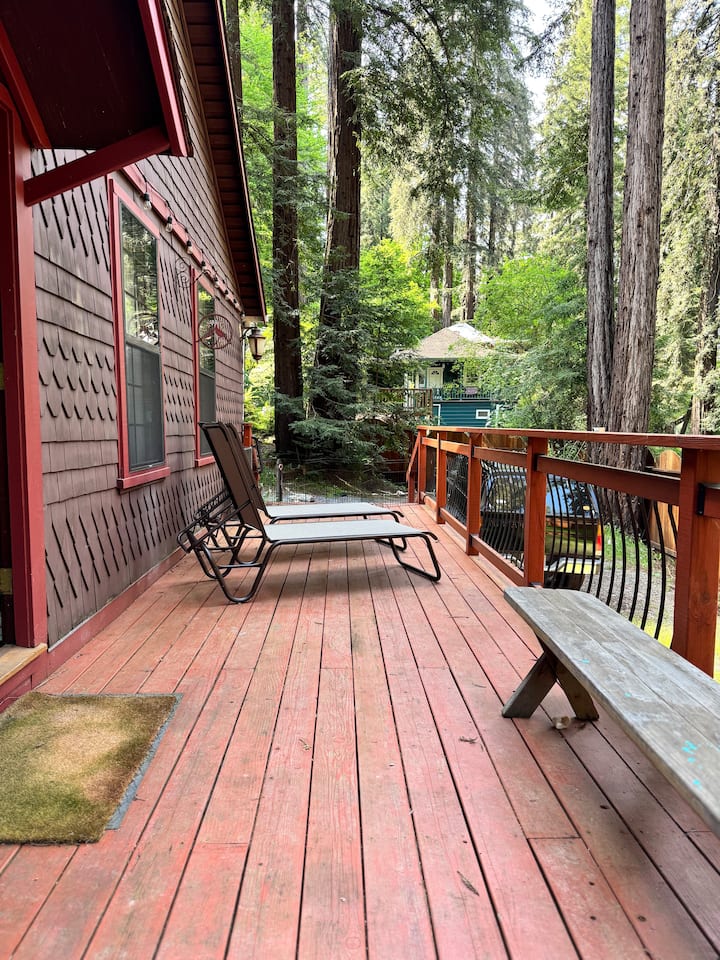 The deck extends into the shelter of the redwoods, offering a quiet spot to pause and take in the crisp air. Free parking on the property accommodates up to 3 vehicles, and privacy fencing adds to the secluded feel. An outdoor dining area provides a simple forest-side place to gather between outings.