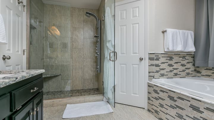 A second downstairs bathroom features a shower/tub combo with gorgeous tile work, beautiful faucets, custom quartz countertops and a bidet. Towels, hand towels, washcloths, hair dryer, shampoo, conditioner, lotion and cups are provided.