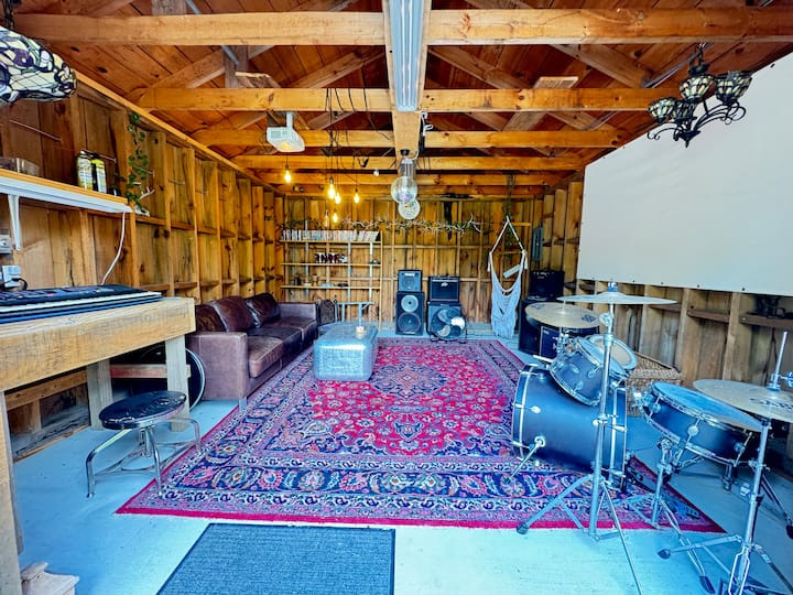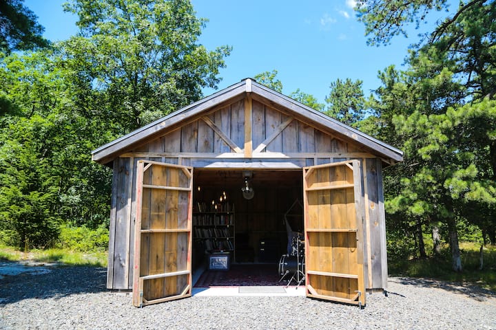 Only about 2 hours from NYC, Stony Kills Ranch is a bright 4-bedroom house with a wraparound deck sitting on 30 acres of gorgeous green property. Our house is perfect for any weekend getaway or vacation with family and friends. Year-round, guests can soak in the outdoor hot tub, stargaze from the porch and roast marshmallows around our fire-pit. You can even take a short walk directly to the famous Stony Kill Falls, a spectacular waterfall that flows off of a high ledge and down into shallow green pools. Spend the summer weekends, camping, hiking, grilling outside and playing horseshoe in our horseshoe pits. During winter, enjoy nearby winter hiking, snowshoeing, ice climbing or cross-country skiing. Three floors, four bedrooms—downstairs we have a full kitchen (with dishwasher!), living room with Sonos speakers, a dining room, and a working wood stove. Two bedrooms upstairs have king size beds, one has a queen size bed and the one has bunk beds perfect for kids. (Or, honestly, even adults—the mattresses are very comfortable) and a basement with two additional single beds. Guests will find the home stocked with all the necessary amenities including towels, linens, kitchen basics and toiletries. Forget something? Wal-Mart Supercenter is ten minutes away and you have quick access to a number of farmers markets and restaurants in Kerhonkson, Accord, High Falls, Stone Ridge, and Rosendale. New Paltz is just 25 minutes away. We’re also a quick 20 min to the Shawangunk Mountains (or, the “Gunks”), famous among rock climbers—also home to waterfalls like Verkeerderkill, Awosting, Buttermilk and VerNooykill. The property includes a hot tub for you to relax in, a grill on the deck, a music studio to jam out in (bring your own guitar, we got the rest), or warm up next to our firepit/fireplace. Additionally, we have an assortment of activities from horseshoes, foosball to board games. Make the most of our Jam Shed — perfect for rehearsing, recording, or just jamming out! We have a full drum set and other equipment already set up. It also features a projector for movie nights and a great selection of vintage classic DVDs.