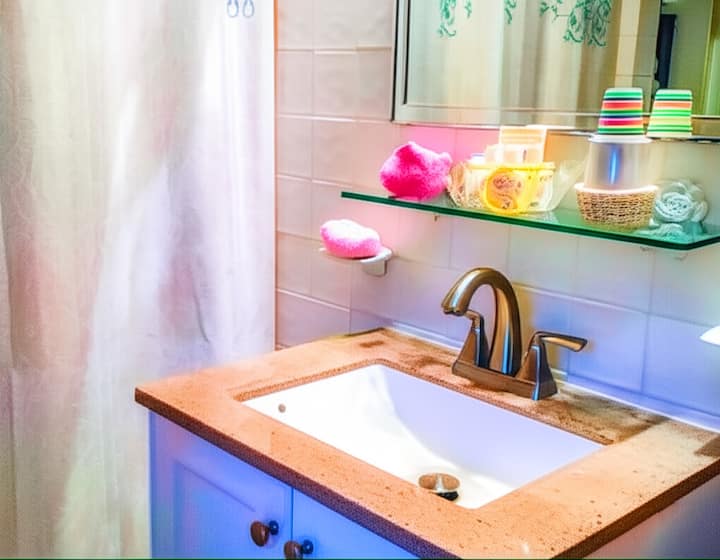 ✔ Large private bathroom: tub + shower combo, stocked with towels & toiletries.