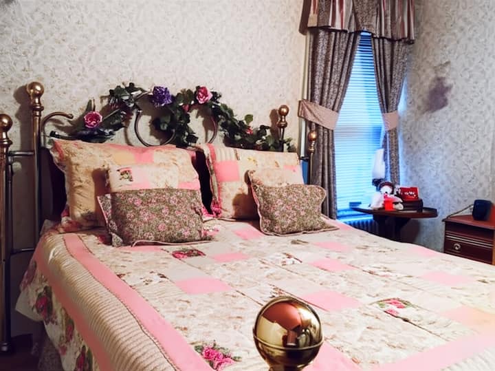 Room #5 sits on the third floor of the Manor House, where the roofline creates charming sloped ceilings and tucked‑away corners. Natural light filters in during the day, and soft lamplight makes evenings warm and intimate. The décor leans country‑cozy—floral wallpaper in pinks and greens, quilted bedding, and vintage accents that nod to the property’s historic roots without sacrificing comfort.