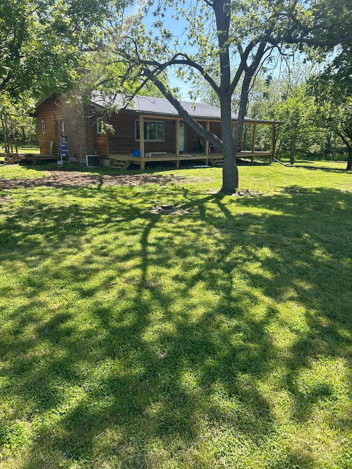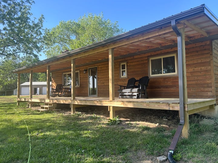 A countryside home, our 1200 sq ft cabin near Emporia, KS features 2 bedrooms (king/queen), 2 baths, big living room, new appliances, kitchen, laundry room and more on a 46-acre, secluded farm. The front porch overlooks a farm field and timber. Walk our trails and skip rocks in Hill Creek. Enjoy the fire pit. Or jump on the Flint Hills Nature Trail - one of the longest rail trails in the US and a favorite for hiking and biking. The FIFA World Cup at Arrowhead is only 110 easy miles away.