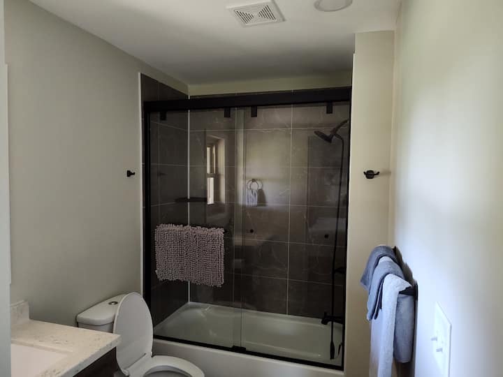 Inside, the cabin is modern and beautiful with all new appliances, furnishings and everything else. Showers in both bathrooms, shower/tub in the master bedroom bathroom. Remote control ceiling fans. Gas log fireplace (won’t be active until fall). There are box fans in each bedroom (we use them to sleep, thought you might like it too). Each of the bedrooms has touch-activated lamps with USB A and C inputs. You can also charge your devices from the powered couch and loveseat in the living room.