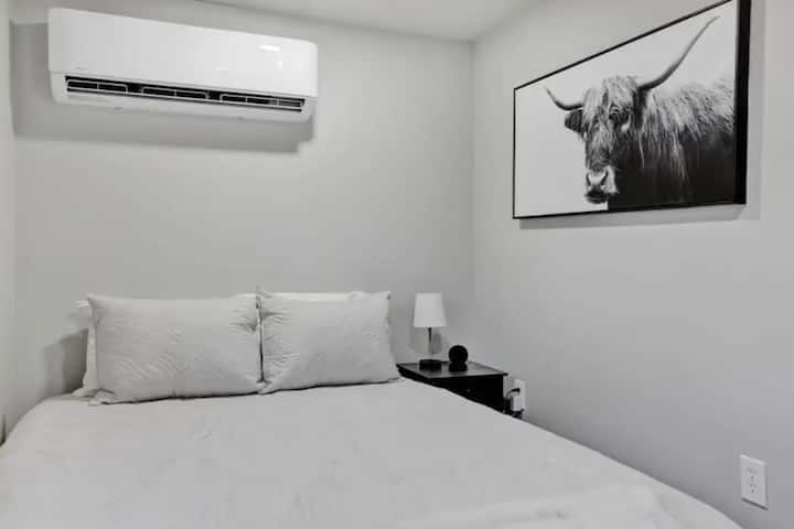 Step into a serene retreat designed for comfort and relaxation. The bedroom features classic white walls and warm wooden flooring, creating a clean and inviting atmosphere. Enjoy a restful night’s sleep on a cozy queen-sized bed, complete with a high-quality mattress, plush pillows, and a soft quilt.