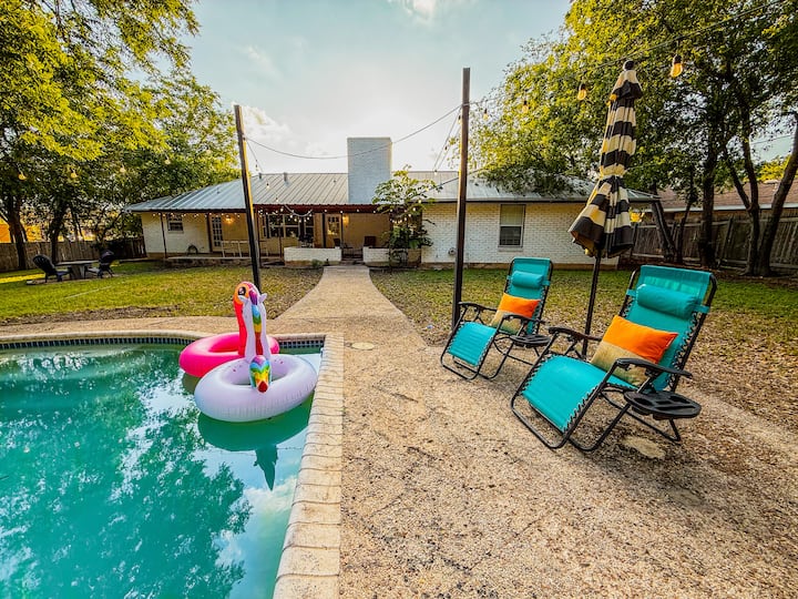 Casa Castillo is a bold and colorful 5BR retreat in Castle Hills, just minutes from downtown San Antonio, SeaWorld, and Lackland AFB. Enjoy spacious living, a game room with pool table, and a private backyard oasis with a pool, ping pong, grill, and smart TV. Perfect for families, groups, or work trips—this vibrant home was made for relaxing, gathering, and making memories.