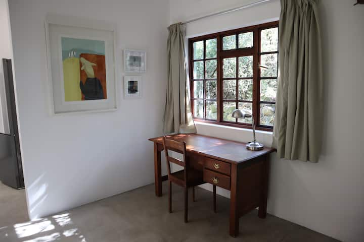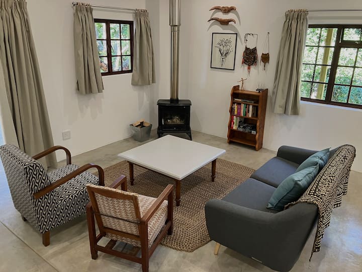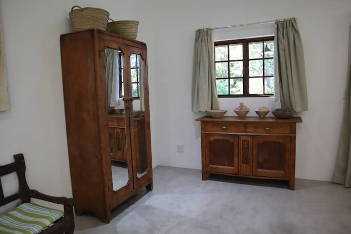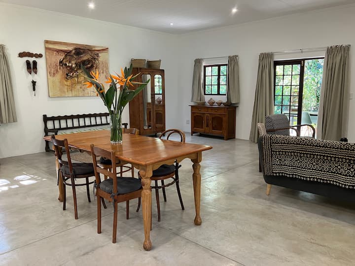 Escape to a creative space in this calm, stylish getaway built where generations of artists have lived and worked. The open plan living and working area opens onto stoeps around two sides of the house. The bedroom welcomes the morning sun with views into trees and boulders where resident bush squirrels chatter. Nestled into a small ridge of indigenous lowveld trees with an irrigation canal flowing peacefully along the side, the house looks out onto a magical four-hectare garden of delights.
