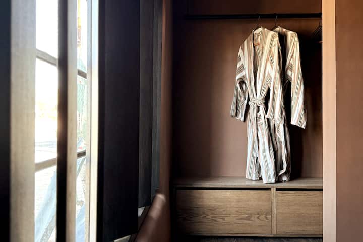 Offering a king-size bed with layered bedding for unparalleled comfort and a selection of pillows to match your preference, you may not want to leave the bedroom. Taking special care of our guests' privacy within a pedestrian and tourist-friendly neighborhood, the EGM's dramatic wooden window louvers filter light and shadows throughout the day for visual interest as well as enhanced discretion with an automated roller shade in the bedroom.