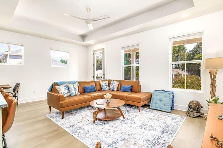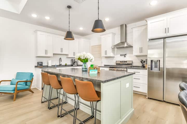 Relax in modern comfort at the Decompression Zone. Step through the front door of the modern craftsman cottage and you are welcomed into a spacious open-concept great room which features leather seating and an 86" smart TV. The gourmet kitchen is perfect for creating meals at home, with both bar seating at the large island and a dining area. The laundry room with new washer and dryer is located off of the kitchen. The decor is modern coastal with a nod to the owner's career as a diver and love of the ocean.