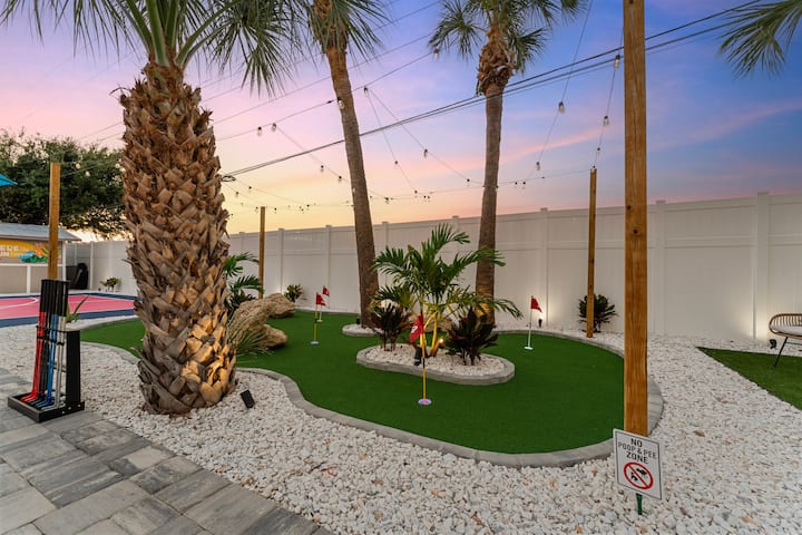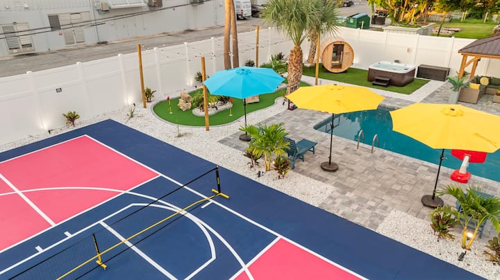 • Step into your private backyard oasis: unwind in the hot tub, pool, or sauna, and keep the fun going with pickleball, basketball, bowling, and mini golf — there’s something for everyone!