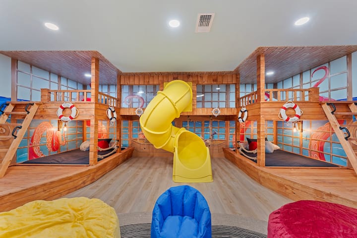 • Custom-designed boat-themed bunk beds with a slide — a fun space where kids can let their imagination set sail!