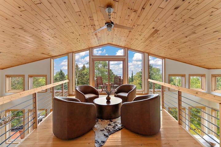→ Raised lounge space offers dramatic views of Lake Superior, ideal for reading or watching the sun rise