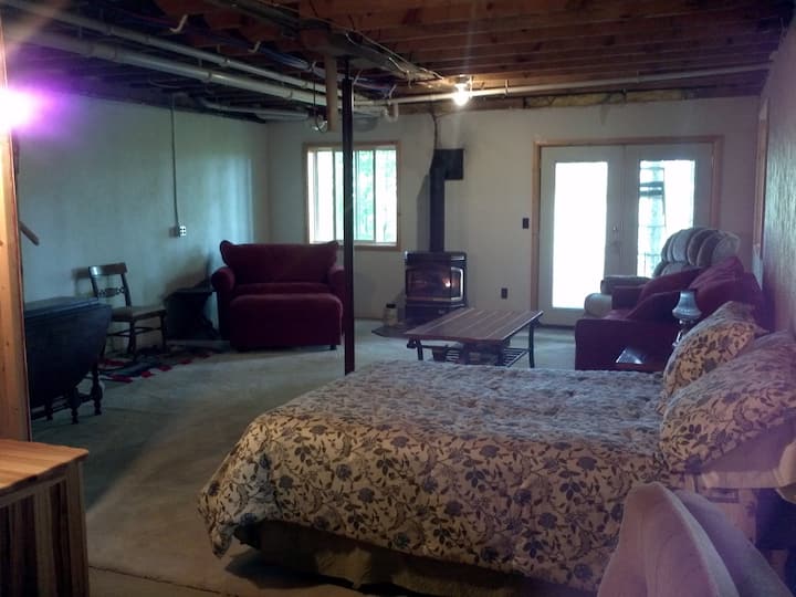 This cozy log cabin in the town of Fence WI was built on an Amish farm in Southern Wisconsin and moved to the Northwoods in Two sections. Make sure to check out our photo album in the cabin, it was quite the process. Everywhere you look you can see the Amish influence, from the Humphrey gas lights to rustic hickory furniture. It features a full kitchen, modern bath and two sleeping lofts with a catwalk joining between them. One loft has two comfortable queen beds and the other loft has a king and a full bed with all fresh linens provided. The kitchen features an LP 4 burner cook stove with an oven, LP refrigerator, hot water on demand system and all the supplies you need to make any meal. The living room is set up for casual comfort to relax in after your adventures. Drink hot cocoa and warm up by the fireplace nestled in a custom stone hearth made with handpicked fieldstone. Two high quality queen sofa sleepers are available for main level comfort. Additional space is available in the walk out basement. Enjoy two LP gas fireplaces, ½ bath and additional sleeping space. The basement has a Queen and Full bed as well as a Full Sleeper and Twin Sleeper. Many guests prefer the basement in the summer for cooler sleeping. Solar Panels charge a 12 volt battery bank in the basement that is inverted into 110 to power the outlets, limited lights and ceiling fan. Supplemental electricity is effortlessly accessed from inside the cabin by the simple push of a button to start the LP generator located in its own building outside. The outdoor fire pit is a short stroll from the cabin for making s'mores under the stars – All camp wood is provided as well as wood for heating the cabin.