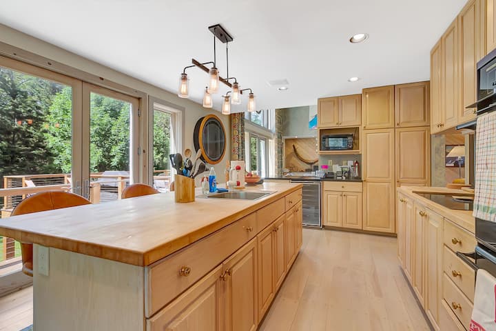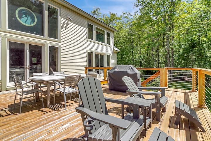 This floor is also where you'll exit out onto the patio. (3 season - closed in winter). Deck is adorned with outdoor furniture, a large solo stove and a propane BBQ grill. So, kick back and enjoy your drink of choice after a long day hiking, biking, golf, or shopping in Manchester.