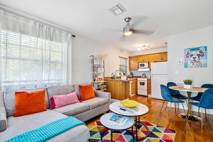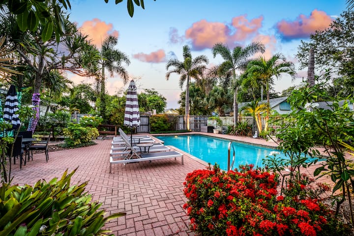 Why pay outrageous prices at crowded Florida beaches when you can enjoy the same sun and sand at our hidden gem? With a track record of happy guests, your beach getaway is not only fabulous but also affordable. Just 1.5 miles from the beach and steps from downtown cafes, music and parks. You'll LOVE floating in our pool and lounging in the palm tree lined courtyard. Minutes from golf, fishing, boating. Enjoy a king bed, Starbucks starter coffee, parking, washer/dryer and zero checkout chores.