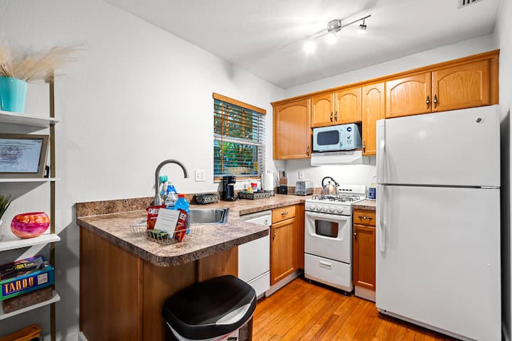 Enjoy a king bed covered in white cotton linens, a sleep sofa, and a 55" SMART Roku TV. Spa-like amenities in the bathroom, a fully stocked kitchen, central AC, in-home washer/dryer and fast WIFI make your vacation comfortable. For security, there is a security camera located in the courtyard and also at the rear gate of the property.