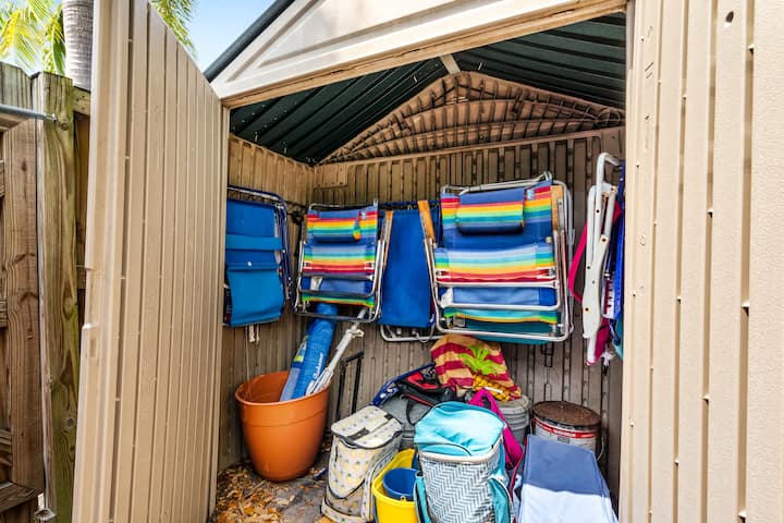 Complimentary bonuses include beach towels, beach bag, heated pool, and one parking spot. There is a shared shed stocked with beach chairs and umbrellas available on a first come first served basis. With central AC, in-home laundry, and nearby support from us, your stay is worry-free.