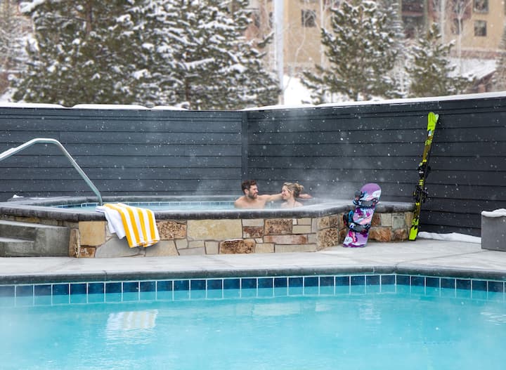 Please note: Our heated outdoor pool is open but the hot tub is temporarily closed for repairs. All other amenities—including our fitness room with sauna, game room, fire pits, and ski valet service—remain available for your mountain adventure.