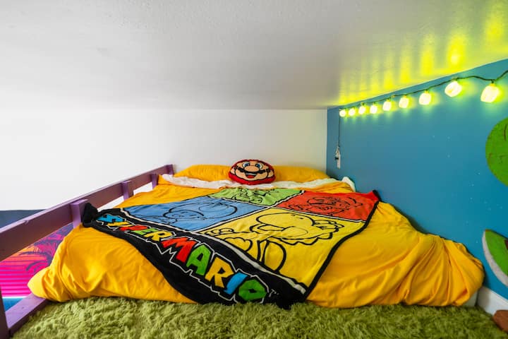 ✔ Queen bed with retro Mario décor