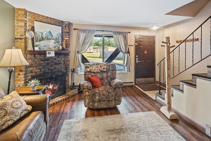 A spacious living area with a wood-burning fireplace 🔥 (perfect for après-ski cocoa or a glass of wine after a hike).