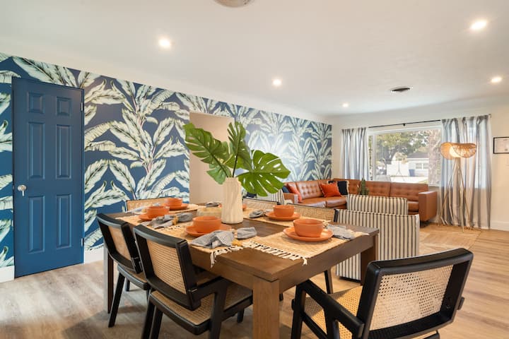 Escape to this beautifully renovated 4-bedroom, 3-bathroom home featuring designer furnishings and thoughtful touches throughout. The open-concept living area flows seamlessly into a fully-equipped gourmet kitchen with modern appliances, perfect for preparing group meals. Gather in the spacious dining area or relax in the stylish living room.