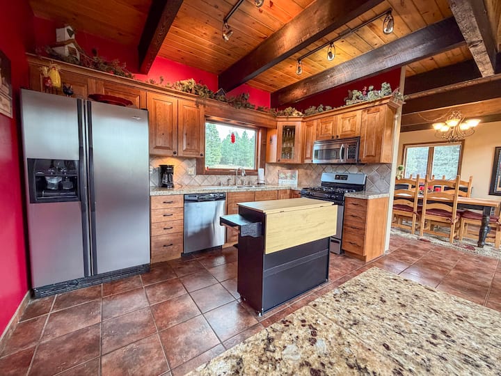 Kitchen: This gourmet kitchen is a chef’s dream, offering ample counter space and equipped with all the tools needed to prepare everything from a quick breakfast to a gourmet dinner. The appliances include a four-burner range stove, an oven, a microwave an ice maker and water dispenser, a hand mixer, a crock pot, a griddle, a toaster, and a blender, among others. The kitchen is also stocked with pots, pans, utensils, and basic spices. Additionally, it includes a drip coffee maker and is supplied with enough ground coffee to get you started during your stay.