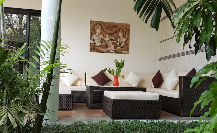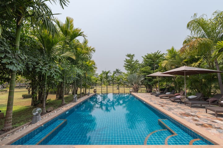 Our location offers a private and tranquil setting, nestled in the peaceful ambiance of a typical rural Thai neighborhood, surrounded by the serenity of the countryside akin to an in-the-jungle experience.