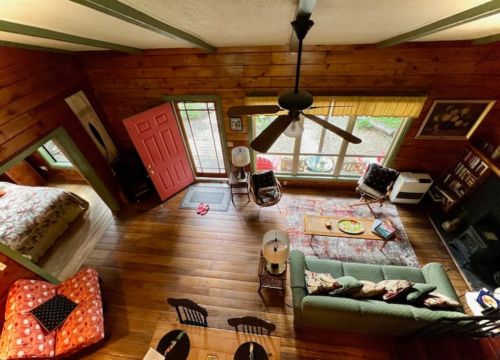 Downstairs, the inviting living area includes a queen pull-out sofa, perfect for lounging or accommodating extra sleepers. A window A/C unit keeps the space cool and comfortable during the warmer summer months.