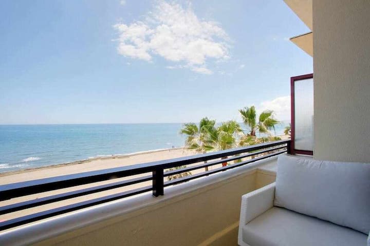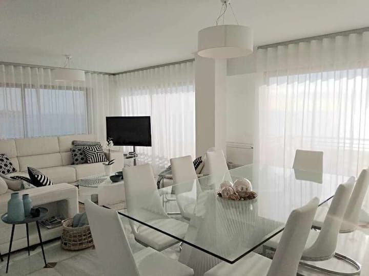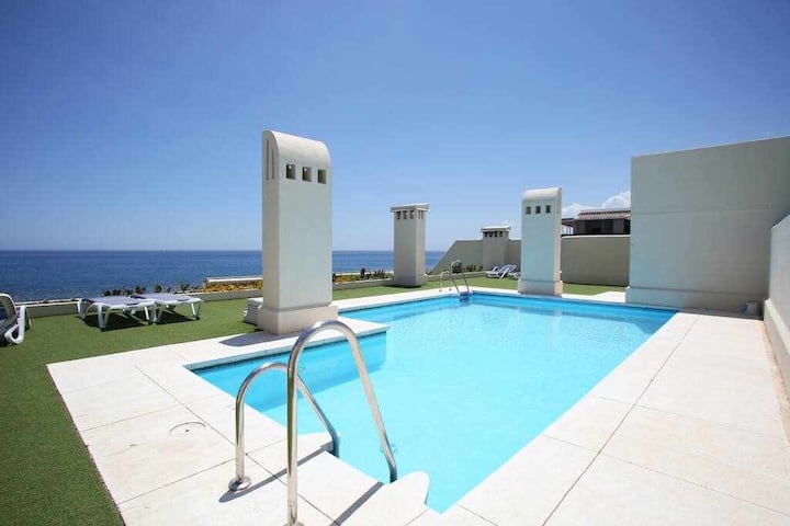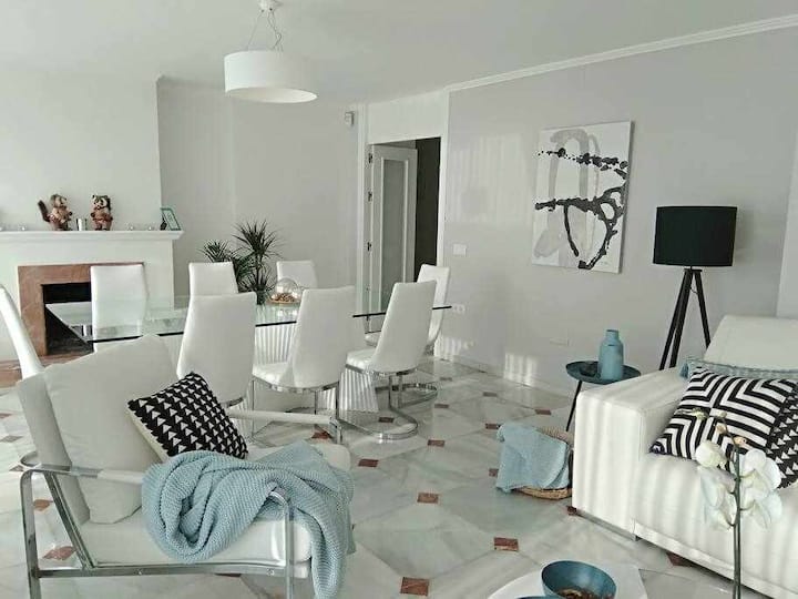 Our penthouse in the heart of Estepona has stunning sea views over the Med & towards Morocco. It has been refurbished and is beautifully decorated to the highest standards with clean modern lines to make the most of your comfort and the space. Over 120 sq.m interior, and over 100m of terraces. With 3 bedrooms and 3 bathrooms, 2 decorated terraces, one by the living room, and one on our private roof w/ dining area, shower, loungers and sunbeds. It has a shared pool & tennis on 5th floor.