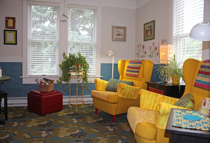 We've made Bobbin house our "cabin" next door. It's where we do the fun stuff we enjoy and it lets us share the fun with our guests. The silliness and creativity extend up to the second-floor guest suite where Tom went crazy painting the walls in the style of theater sets. We'd love it if you want to take a fiber-arts class in the studio during your stay.