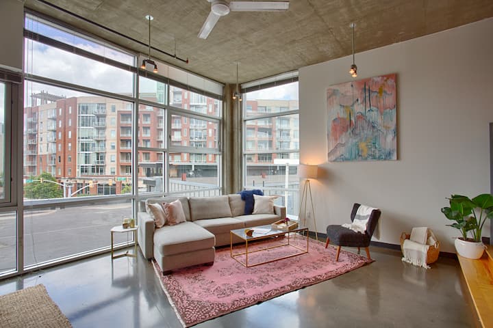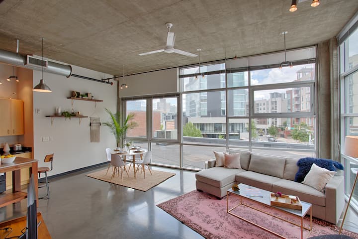 When you are spending time in the loft, we have made every effort to make sure you feel at home. This loft features 15ft ceilings and huge windows looking out onto Nashville and the vibrant Gulch neighborhood. The loft has 1 true bedroom tucked away with a door. The living space is an open concept setting with another bedroom area exposed to the living area and kitchen. There are 2 queen size beds as well as a sleeper sofa with a memory foam mattress in the living room that provides a third sleeping spot if it is needed. We offer a SmartTV with all streaming capabilities (NO cable), high-speed wifi, and a washing machine and dryer in your unit!