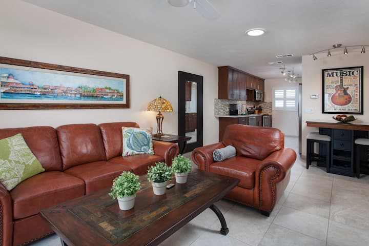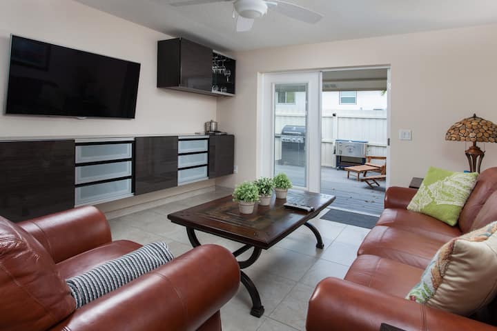 This hidden gem is ideally located in beautiful Indian Rocks Beach across the street from the beach with just a short 2 min walk to the sugary sand shores of the Gulf of Mexico. This is a stylish, newly remodeled 2 bedroom (with king beds), 1 bath ground floor condo with 3 Smart TV's, and your very own enclosed, private deck with outdoor dining and beverage center … everything you need for entertaining outdoors 'Florida style'!