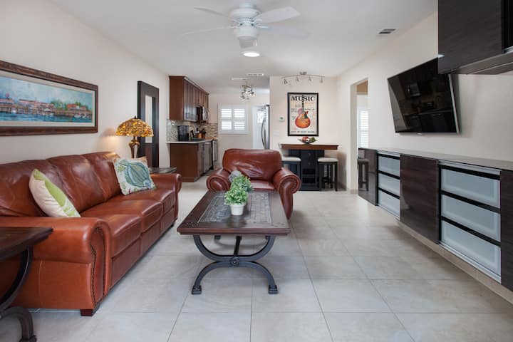Unit has high-end furnishings and is decorated with contemporary beach flair. Free WiFi, wall-mounted flat screen Samsung Smart TV's in the living room and bedrooms and Echo to listen to tunes with Alexa.