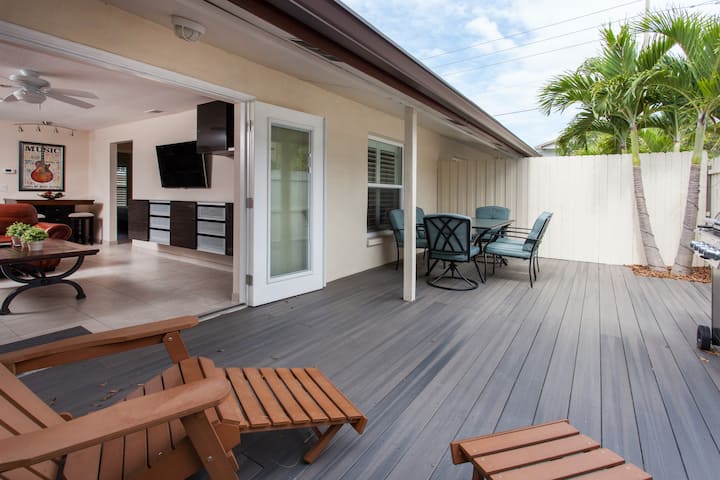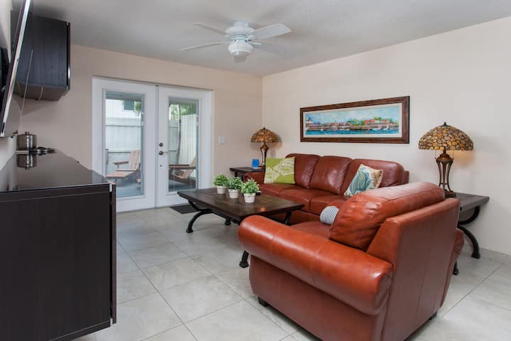 Renovated, nicely appointed 2 bedroom (with 2 king beds), 1 bathroom ground floor unit with your very own expansive, enclosed, private deck with Tommy Bahama beverage center/cooler/bar and outdoor dining … everything you need for entertaining outdoors 'Florida style'… including your very own palm trees!