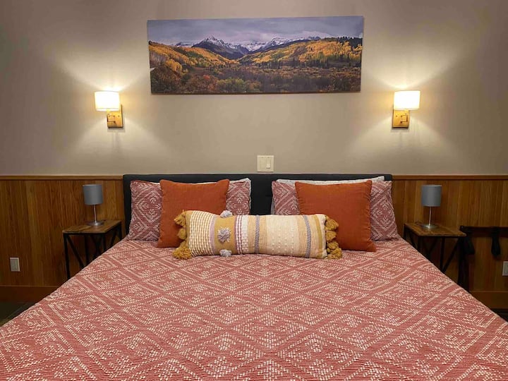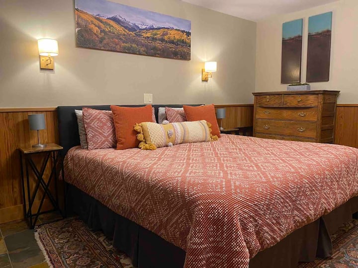 This newly remodeled, spacious, one bedroom one bath condo is located in the heart of the town of Telluride. The front door opens up to Cornet creek and is directly across the street from lift 7 for access to the ski resort, hiking, and biking trails. The complex is as close to ski and ski out as you can get in the town of Telluride. It’s a perfect downtown location for enjoying all the excitement that Telluride offers but also quiet and private.