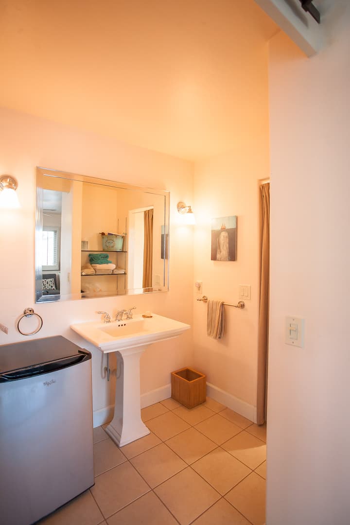 This is a beautiful private Suite with full bathroom, 480 sq ft.+ SUPER CLEAN w/separate entrance. Like a studio apartment w/a small refrigerator, microwave & coffee maker. In a very exclusive neighborhood in Pt Loma, close to everything w/Liberty Station on 1 side (5 min walk) & Ocean Beach on the other side of the pennisula (2.5 mi). The Suite is on the back side of our home (connected but separate) with easy/free street parking. Last minute bookings are welcome! Easy Check in -late night too!