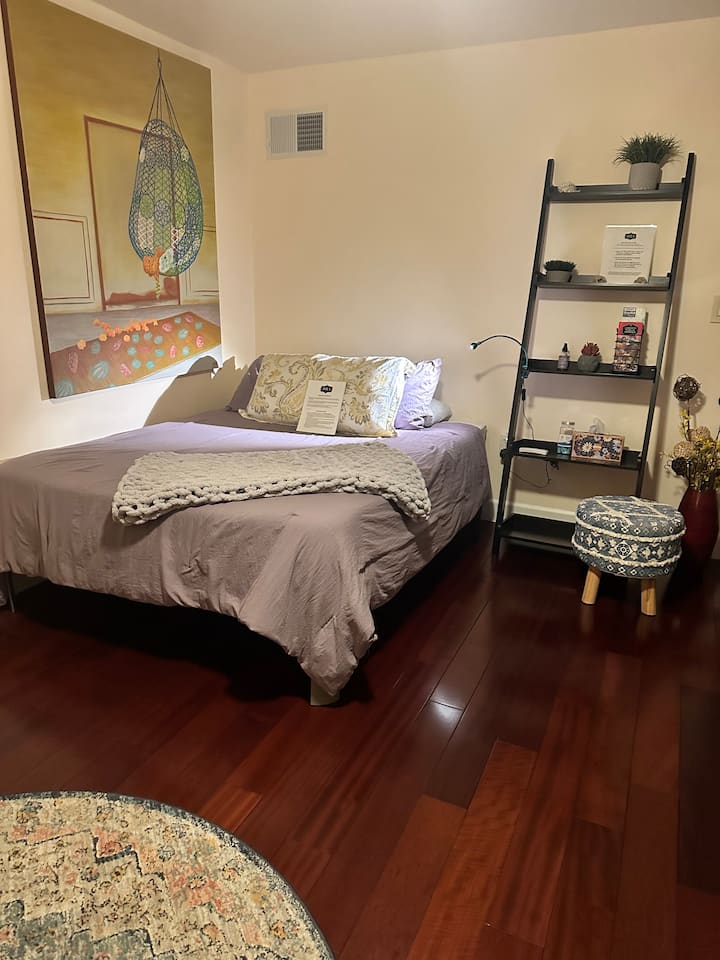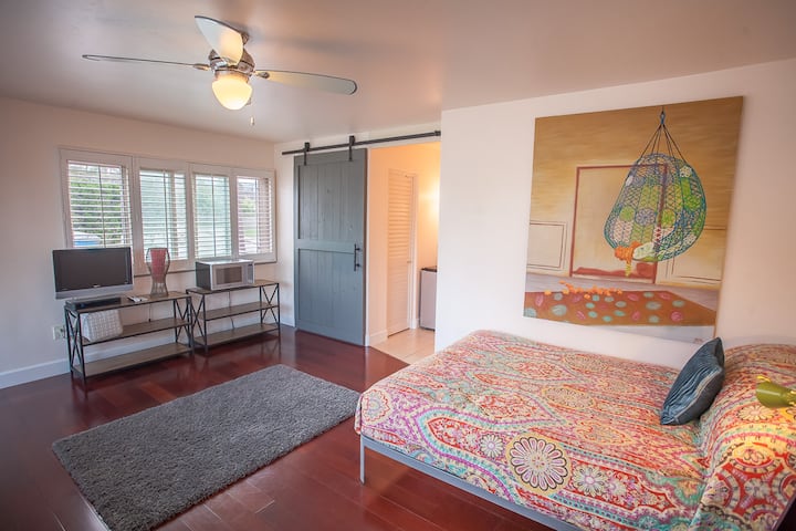 This spacious suite is super clean, with a comfortable Queen bed, nice hardwood floors, tile in the bathroom, small working desk, walk-in closet, barn door, ceiling fan & lots of windows. We provide linens and towels, shampoo, conditioner and body wash. The Suite has a private entry (accessed from our backyard) so it's a separate studio suite with a private full bathroom and shower, and walk in closet. We also provide a coffee maker with coffee & tea, a microwave and mini refrigerator. A portable cold AC and tower fan is added to ensure the Suite stays cool whenever it's hot outside.