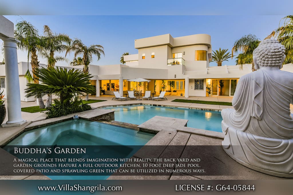 Whether you're in Las Vegas for business or pleasure, you deserve quite and tranquility. With its aqua pools and private landscaping, Villa Shangri-La is reminiscent of a Polynesian oasis in the desert, and the lush greens and subtile architectural details around the grounds will delight you and your guest.