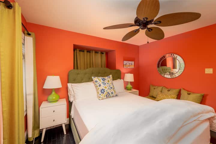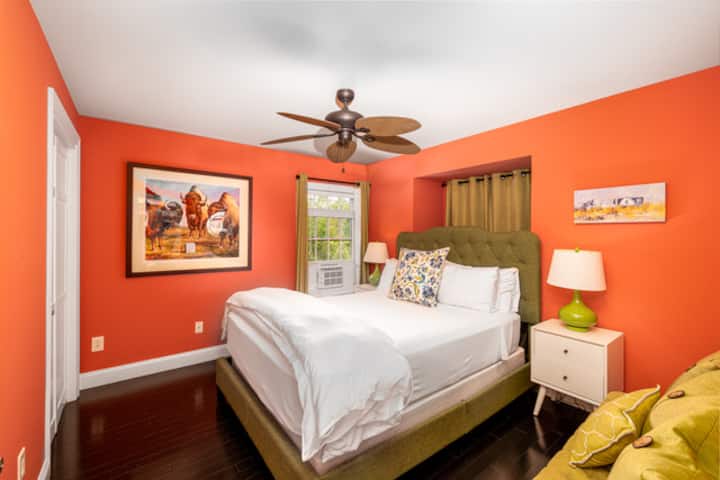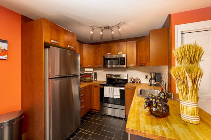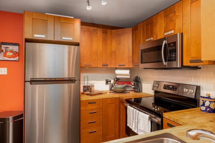 Spacious 2 bedroom with new lovely decor, hardwood floors, great kitchen, cabinets, stocked new appliances, 55" smart WiFi TV, tiled walk-in shower.