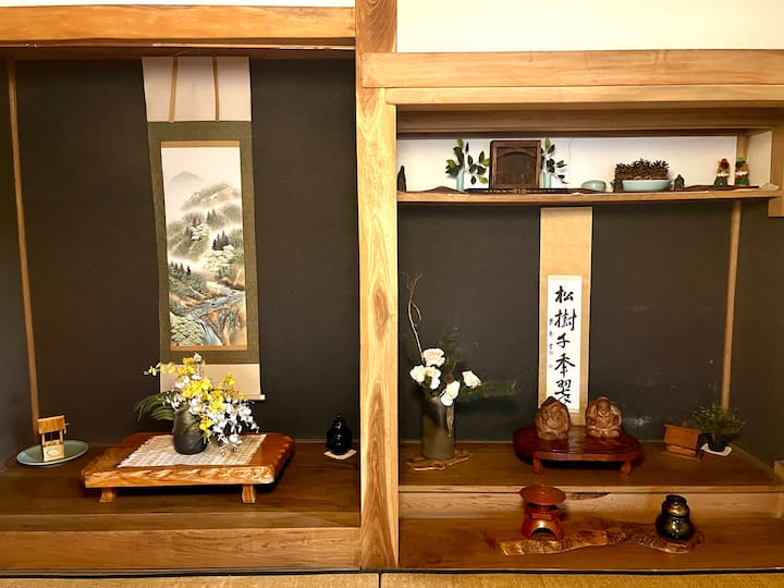 Vacation at a quiet countryside estate. This timber building was lovingly restored with Japanese-style retreats in mind. Enjoy a spacious dining area with six attached tatami rooms surrounded by a wooden corridor. Grill in the yard. Socialize and enjoy a hot pot "nabe" meal at antique wooden tables with warm "kotatsu" blankets. Use of the 1st level and yard, with optional use of the 2nd floor for large group retreats. Walk to Japanese gardens, hot springs and shopping.