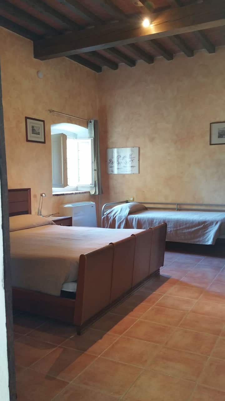1 double bed, 2 single beds, 1 toddler bed, 1 crib